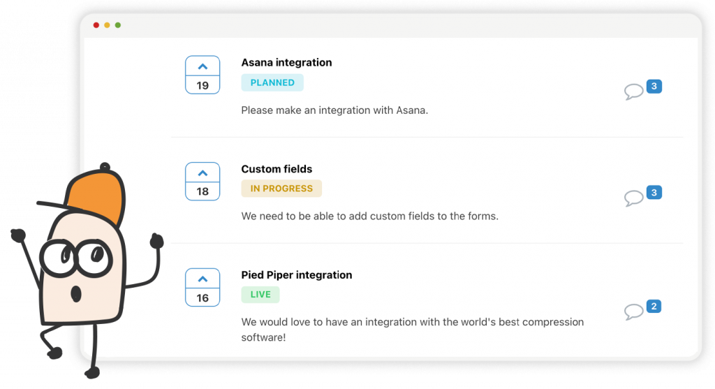 Give your users a voice! Let them submit new feature requests and vote on all feedback so you know what to build next.